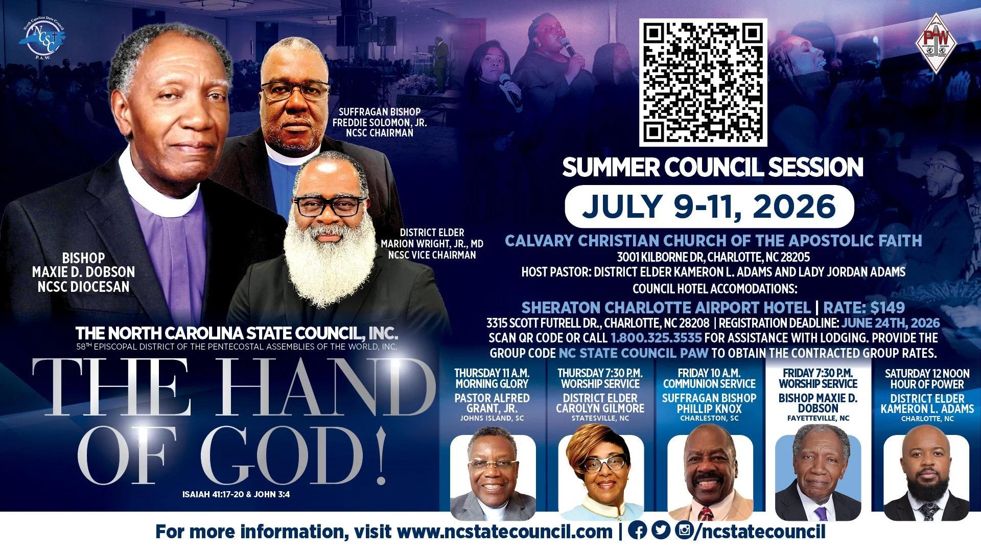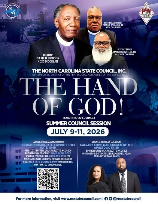 Our Mission is to present Jesus Christ as Lord and Saviour to lost souls, making disciples of them; to plant churches and bring them into our fellowship; to teach, train and develop pastors to grow their congregations, and net worth while embracing the Apostles’ Doctrine that was once and for all delivered unto the saints. The North Carolina State Council is an active affiliate of the Pentecostal Assemblies of the World, Inc.
